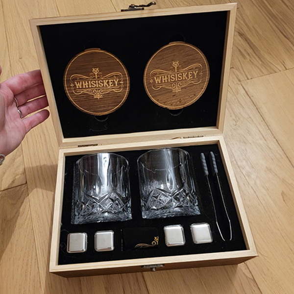 Two handcrafted classic whiskey tumbler glasses with 4 stainless steel whiskey cooling stones. With two wooden coasters and a wooden storage box.